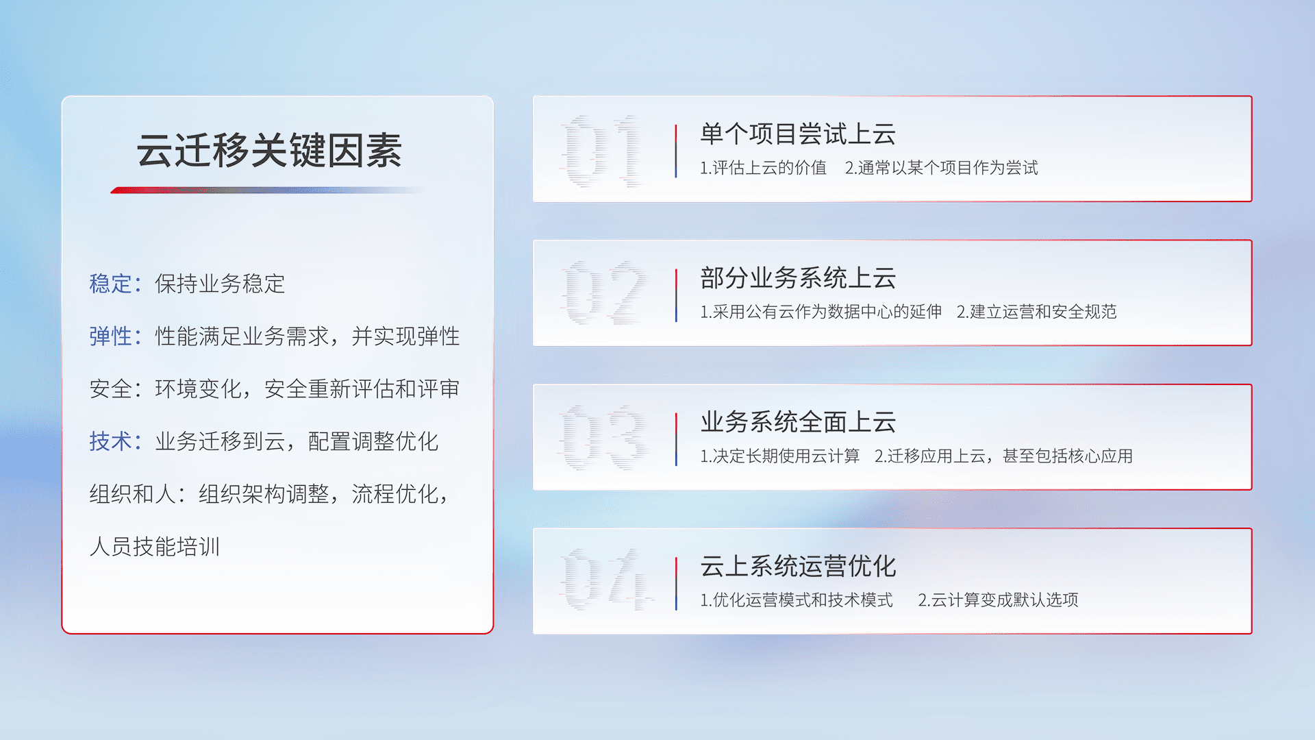 结合实际业务,,,,从规划设计、、、云平台选型、、云原生改造、、、、数据迁移、、、集成交付,,,,迁移全过程为客户识别最佳上云路径,,做好风险识别管理,,设计网络架构、、、、身份权限、、、、安全审计合规、、操作审计、、、日志审计、、监控告警策略、、多站点容灾设计等,,对云上基础设施进行整体规划,,,,提升IT治理水平,,,以满足弹性、、高可用、、高性能的需求。。。。