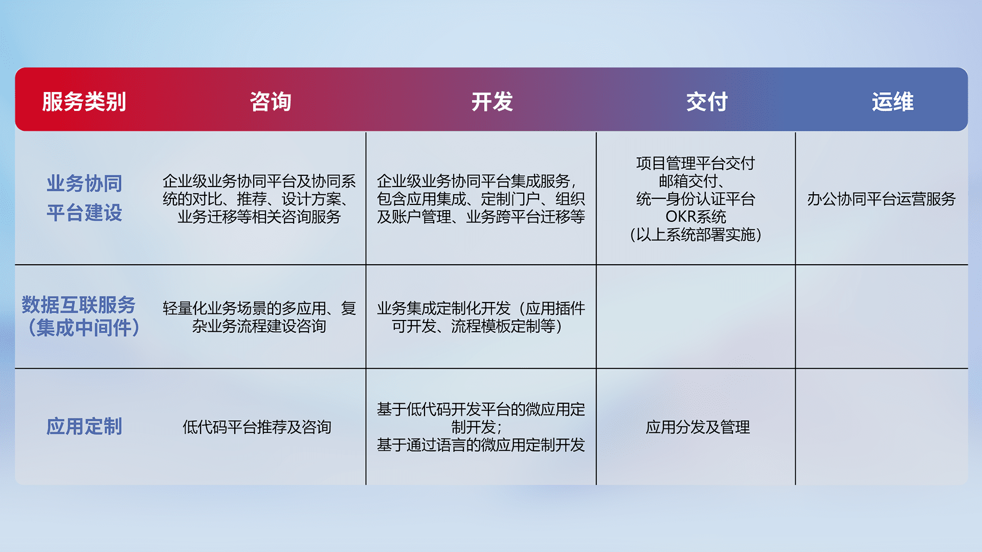 针对钉钉、、、、企微、、、、IDaas等平台级产品提供产品的规划、、方案、、交付、、定制化开发等服务,,实现如统一协同办公、、、智能客户服务、、、混合会议管理、、、智能数据查询、、、、等业务场景,,,实现数字化转型。。